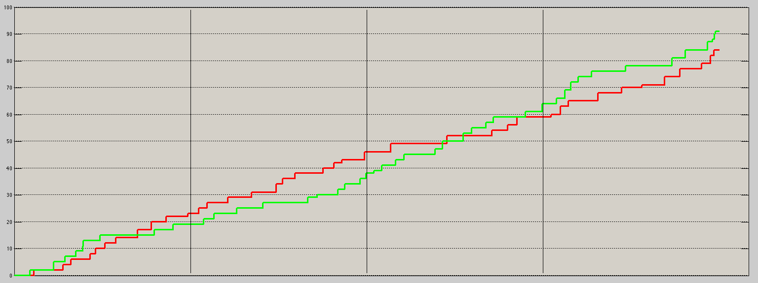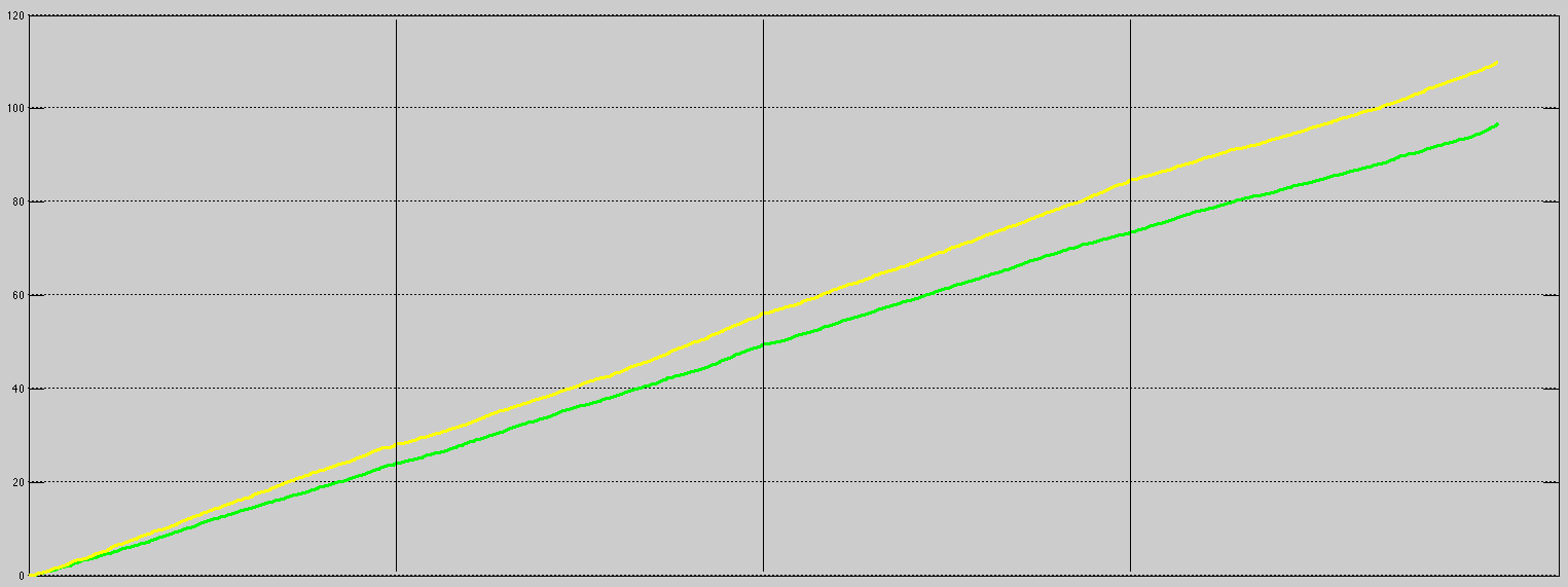 Comparison of Average Score Flows for the Milwaukee Bucks (Green) and Golden State Warriors (Yellow) for the 2014-15 NBA Season. The Warriors are expected an average of a 6.81 point lead at any given moment.