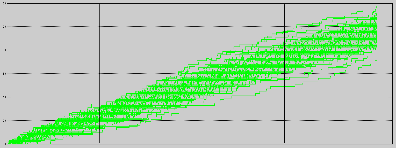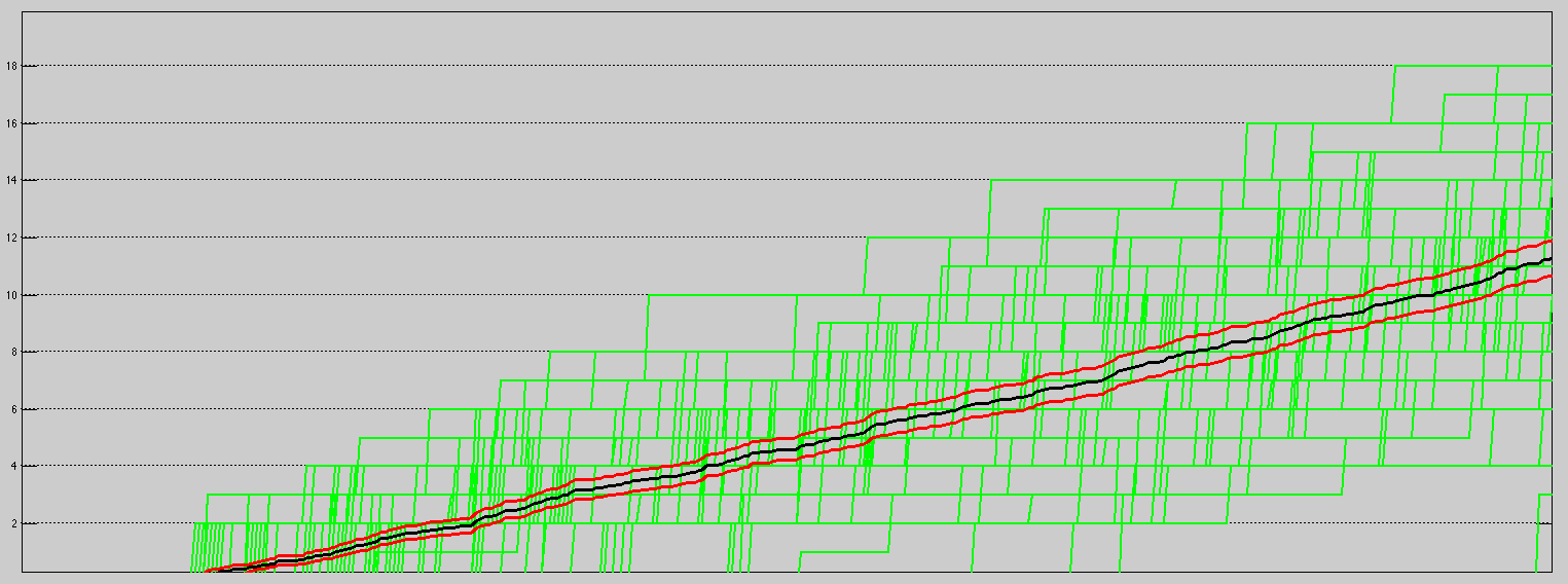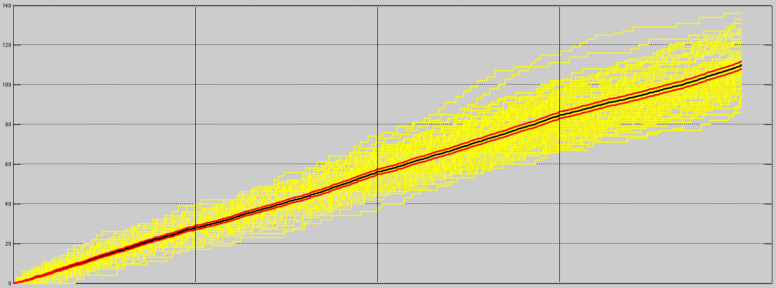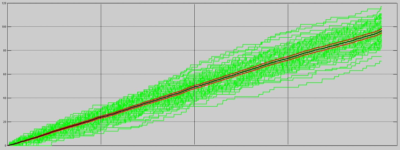 Treating a Score Flow as a series of observations from opening tip-off to the end of regulation, we are able to use the mean Score Flow; an averaged Poisson process. We can also put together a “95% confidence band” for the average Score Flow. An easy way to do this is to apply a point-wise confidence band; which leads to a Bonferroni set.