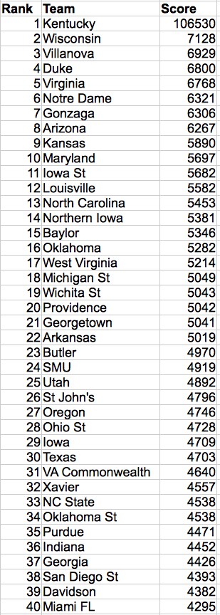 For the 2015 NCAA Division I Basketball playoffs, we took into consideration all 5,788 NCAA Division I basketball games for 351 teams. For fairness, we removed any games that involved Division II, Division III, or any non-NCAA team. From this reduction, we considered a series of three variables: location of game (-1,0,+1), diminishing returns on point differential, and the number of minutes played by starters, weighted by halftime. The result is either a 1 (win) or 0 (loss). Performing a weighted generalized linear model regression against this approximately 5,700 by 350 matrix, we obtained the following ranking scores: