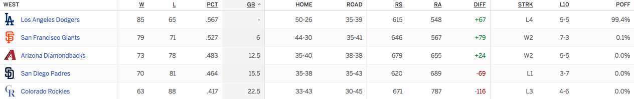 In the National League West division, ESPN predicts that Los Angeles has 99.4% chance of making the playoffs. Similarly, the San Francisco Giants are predicted to have a 0.1% chance. Combined with the three eliminated teams of Arizona, San Diego, and Colorado, this means that at best there is a 99.5% chance that any of these five teams win the division. So where does the other 0.5% go? We simply cannot assume rounding errors, as this would still give a 0.3% offset that is unaccounted for at best.