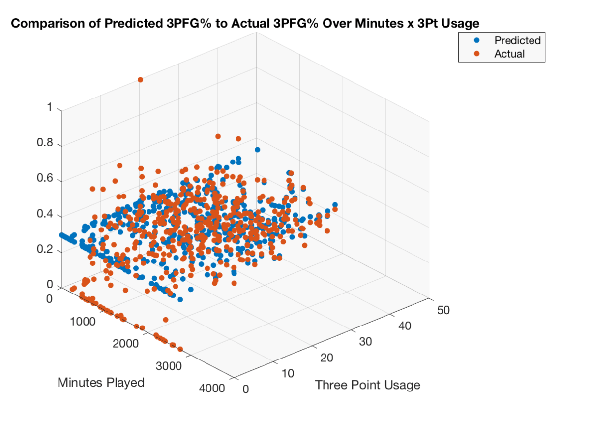 fittedThrees Published August 20, 2017 at 1204 × 864 in Basics in Negative Binomial Regression: Predicting Three Point Field Goal Percentages ← Previous Next → Comparison of Negative Binomial model and actual three point field goal percentages. Zero inflation is in full effect; however it can’t be seen well in this plot. Look at the next one.