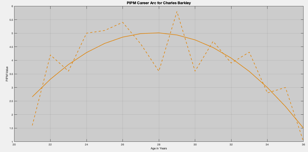 Here, we immediately see the mechanical solution of the career arc for Charles Barkley. Despite PIPM looking fairly noisy, the smoothed arc looks like a really good fit. It captures everything we expect in a player’s career arc: