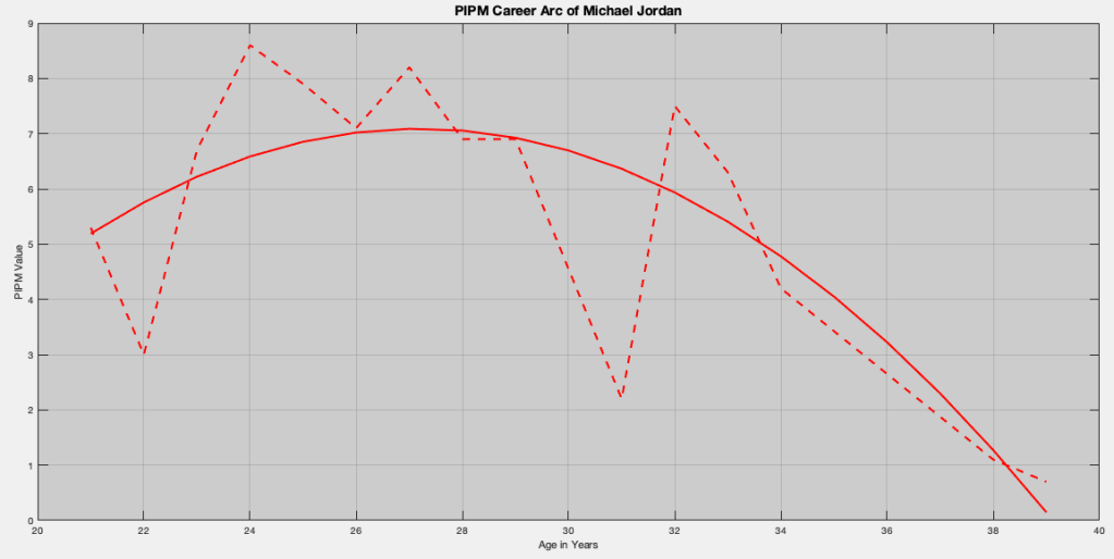 It should be noted that, due to his harsh decline after five years off, the mechanical process becomes biased towards his younger years, making for a peak age of being 26.7578 years, which was the 1986-87 NBA season.