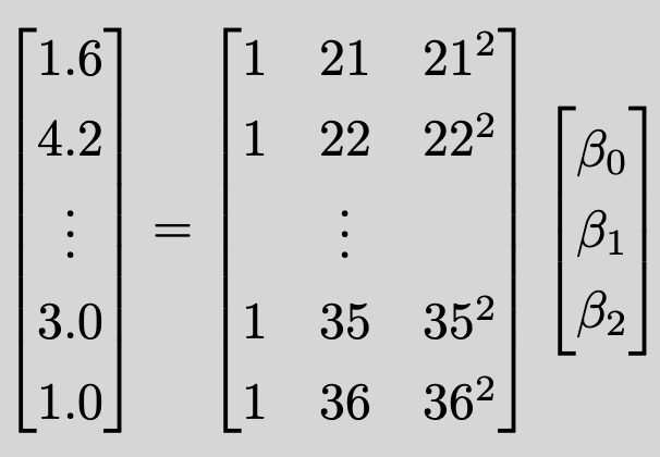 In case you are unfamiliar with least squares, let’s apply this to Charles Barkley’s PIPM values. Sir Charles started playing at age 21 and completed his career at age 36. Therefore, our “X” values will be 21 through 36. Since we are using a constant coefficient, Beta Zero, and a square coefficient, Beta Two, we should also have constant years and squared years! Therefore, we have the system of equations