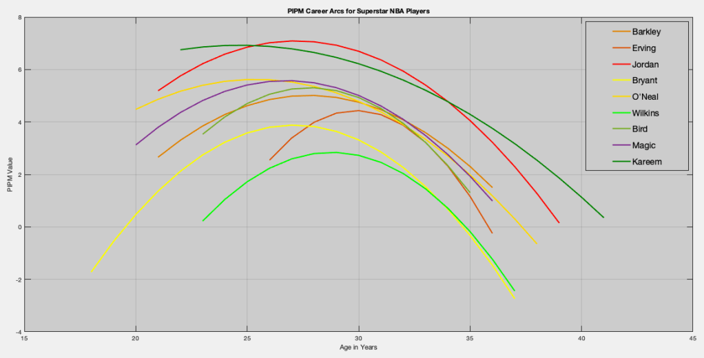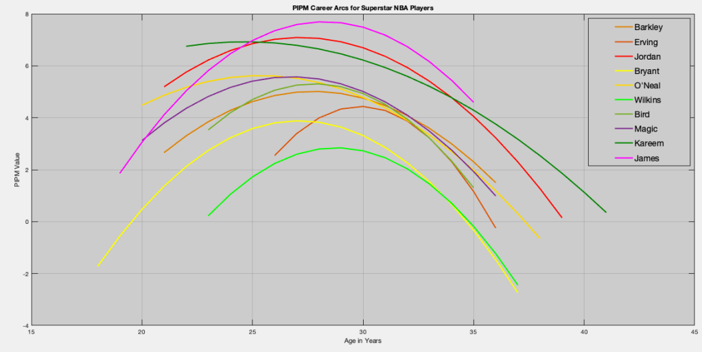 Since LeBron James has already played an entire Hall-of-Fame career, we can apply this same methodology and compare his career arc to PIPM data. In doing so, we observe LeBron’s coefficient set to be -46.5947, 3.8412, -0.0680.