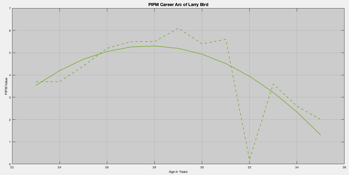 Larry Bird’s coefficients are a little sharper than Barkley’s suggesting a stronger decline; which coincides with his back injuries later in his career. With a coefficient set of -54.2795, 4.2874, -0.0771; we find that Bird’s peak year was at age 27.7960; which is the 1984-85 NBA season, the middle of his three consecutive MVP awards!