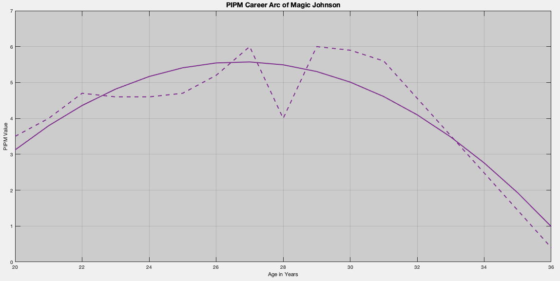 Magic Johnson, similar to Larry Bird, dominated the 1980’s and suffered health disruptions early into the 1990’s. Unlike Bird, Magic attempted a slight comeback late in his career during the 1995-96 (1996) NBA season. Since we are applying a simple regression model, and have “enough” data, we can capture the “predicted” PIPM values for the years missed. Granted, these predictions must be taken with a grain of salt as we did not perform the necessary analysis to validate the model.
