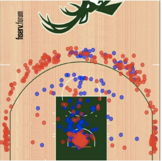 Unfortunately, when originally writing this piece, there was a couple items that came about that identified specified, nuanced trends in players and actions on court. Notice that we did not go into player versus openness. Some work has been performed publicly and for the most part it is consistent with research done behind closed doors. However, there is a distinct difference between top end shooters such as Steph Curry, Bradley Beal, and Damian Lillard versus Russ Westbrook, Nic Batum, and Giannis Antetokounmpo. One end of the spectrum, teams must keep gravity high; regardless the position of the ball. The latter set of players, yielding the open shot is not a problem, provided the spot is not where a player is most comfortable shooting, such as in Antetokounmpo’s case: