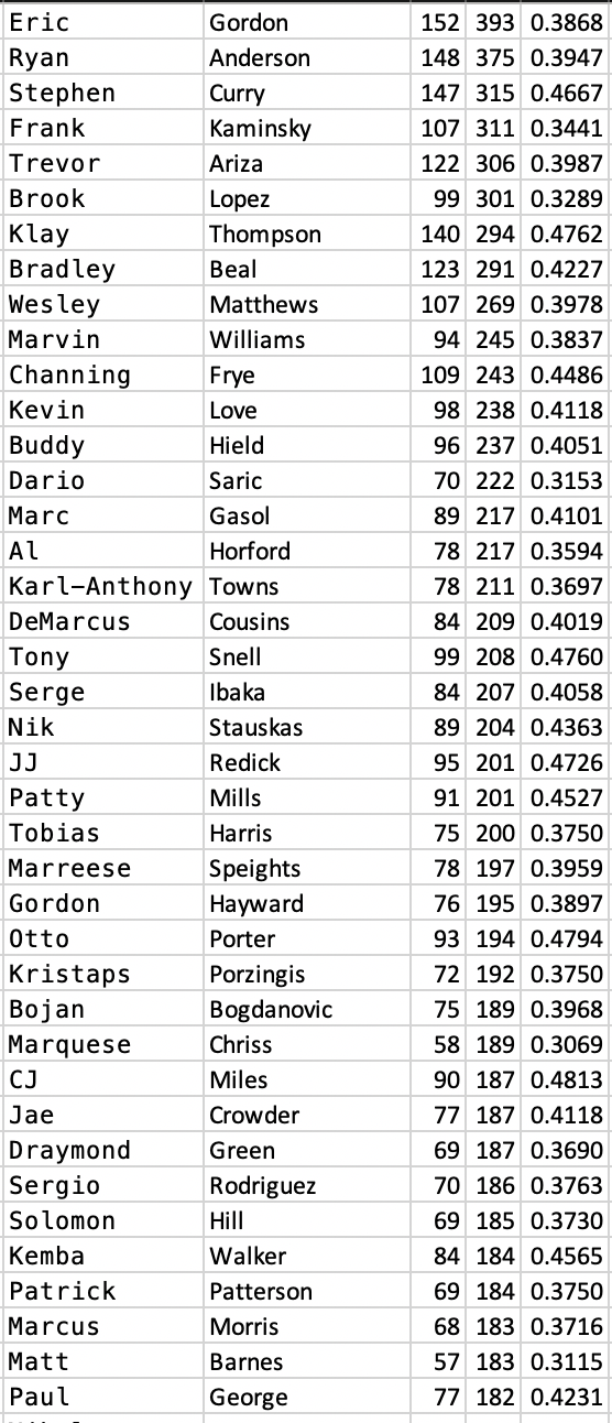 More importantly, a 32-percent open attempt from three still has a higher expected value than a 47-percent midrange attempt. Also, for fun, here’s a listing of the Top-40 NBA Players that attempted the most wide open threes in the 2016-17 NBA Season, per tracking data: