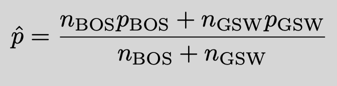 The long answer is this: Let’s write Boston’s defensive three point percentage as (375, 1104) and Golden State’s defensive three point percentage as (397, 1120). If we make assumptions such as each wide open attempt has the same probability of conversion dependent on player skill, that no two attempts are related, and that the effects of fatigue, game state , etc. are negligible, then we can perform the basic two-sample test:
