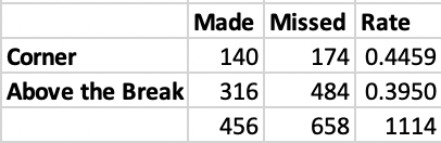 Immediately, we see that there is no effect, but we can test for the effect to be complete in our analysis. The associated t-test is 0.012 (.99 p-value) and the effect size is effectively zero. This indicates that, at a high level, shot location (corner vs. above the break) really is not much of a factor when it comes to wide open three point attempts.