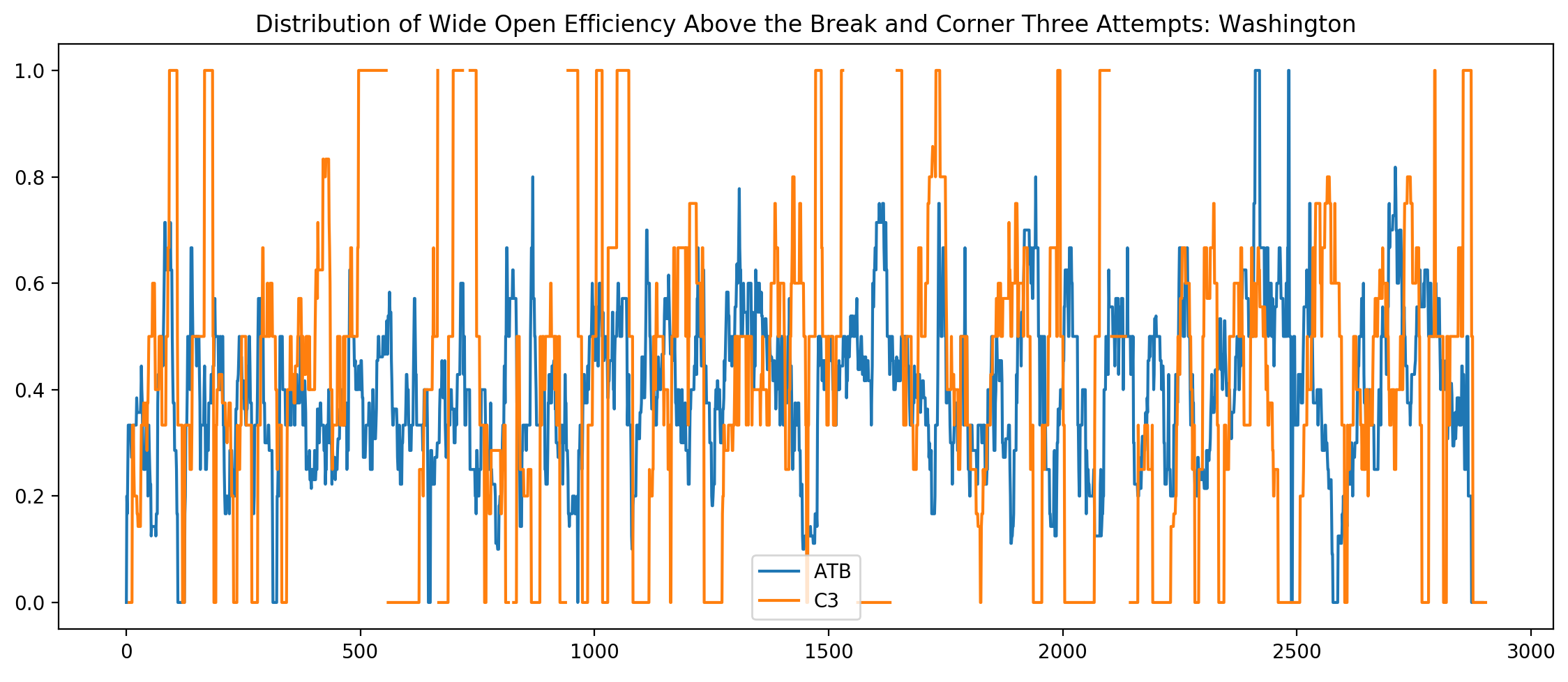 Here, we see the ebb-and-flow of Washington’s opponents when it comes to above-the-break three’s and corner three’s. The sharp cuts at zero and one are low probability events (only one or two attempts across 82 games) and the missing pieces are where no attempts where taken over the 82 game sample. An interesting effect is that Washington’s opponents improve their above-the-break shooting, albeit with larger variance, over the course of the game. We also see their opponents exploit wide open corner three’s during second-string lineups.
