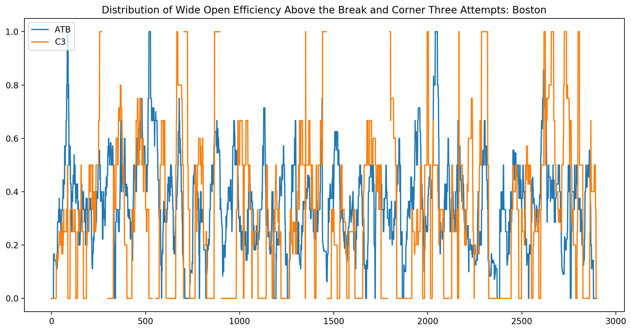 Boston sees a similar second-string effect, but that’s where the similarities end. In fact, the above-the-break percentages drop over the course of the game (negative trend) and corner three’s creep up towards the end of the game. The impressive segments occur in the first few minutes of each half. This indicates that starters have a distinct effect, the only question being: What kind of effect?