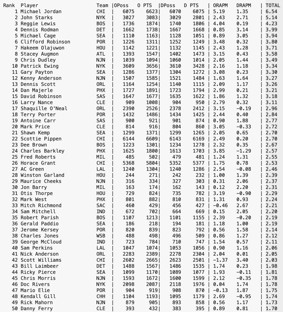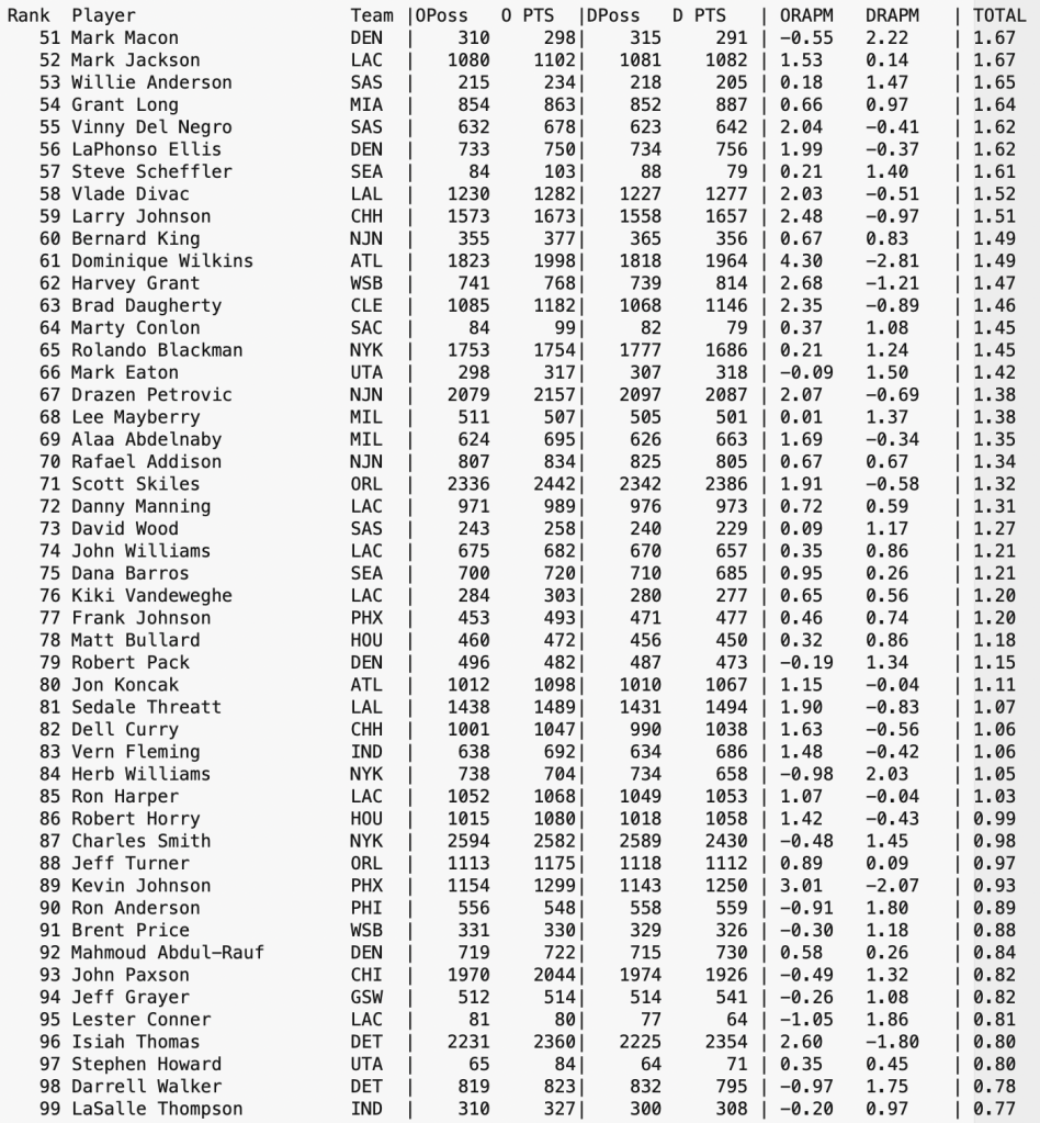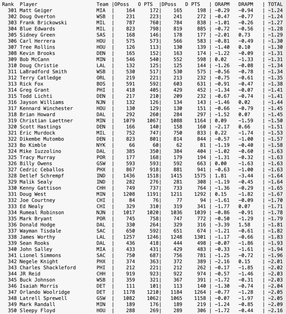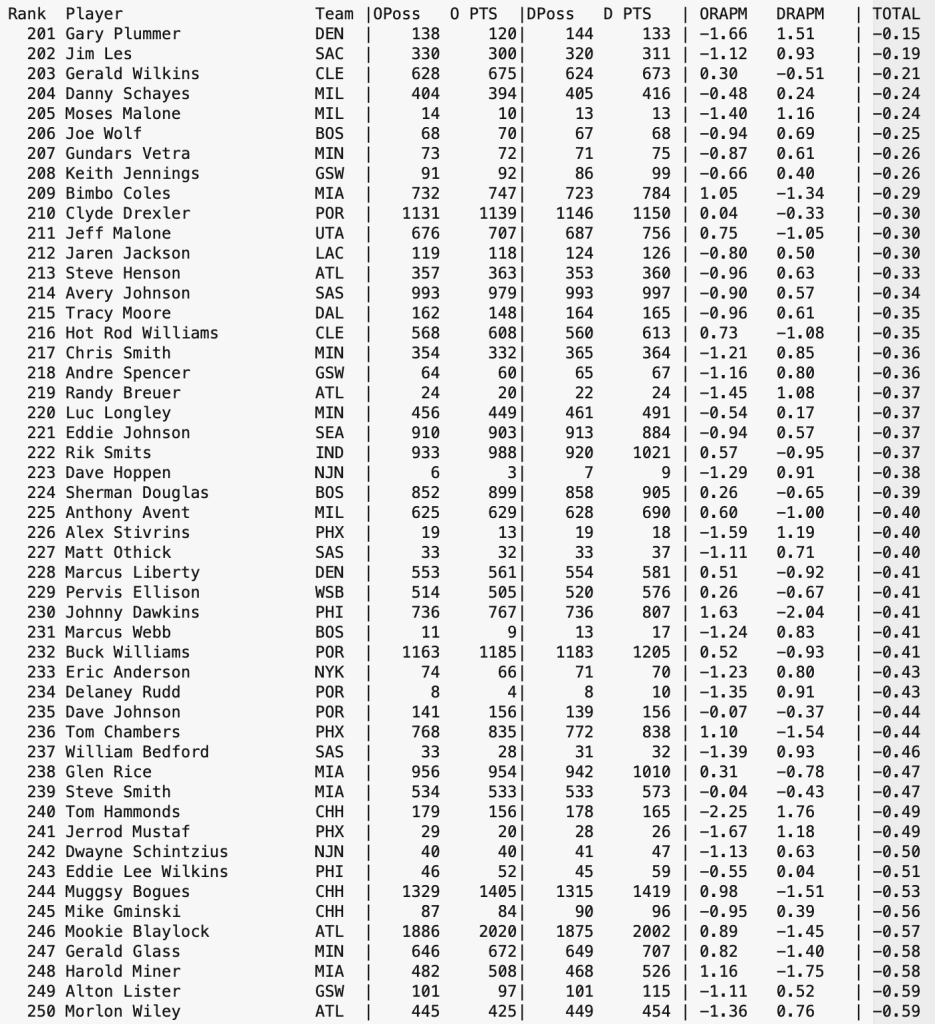From my video library of past games, I have been slowly reconstructing NBA Stint Data for several seasons prior to the 1993 Season’s start of the Play-By-Play era of statistics tracking of NBA games. This is a lengthy effort in trying to give some insight to interactions between players, at least from a stint level. When the project is more complete, data will become more readily available. Until then, here is a