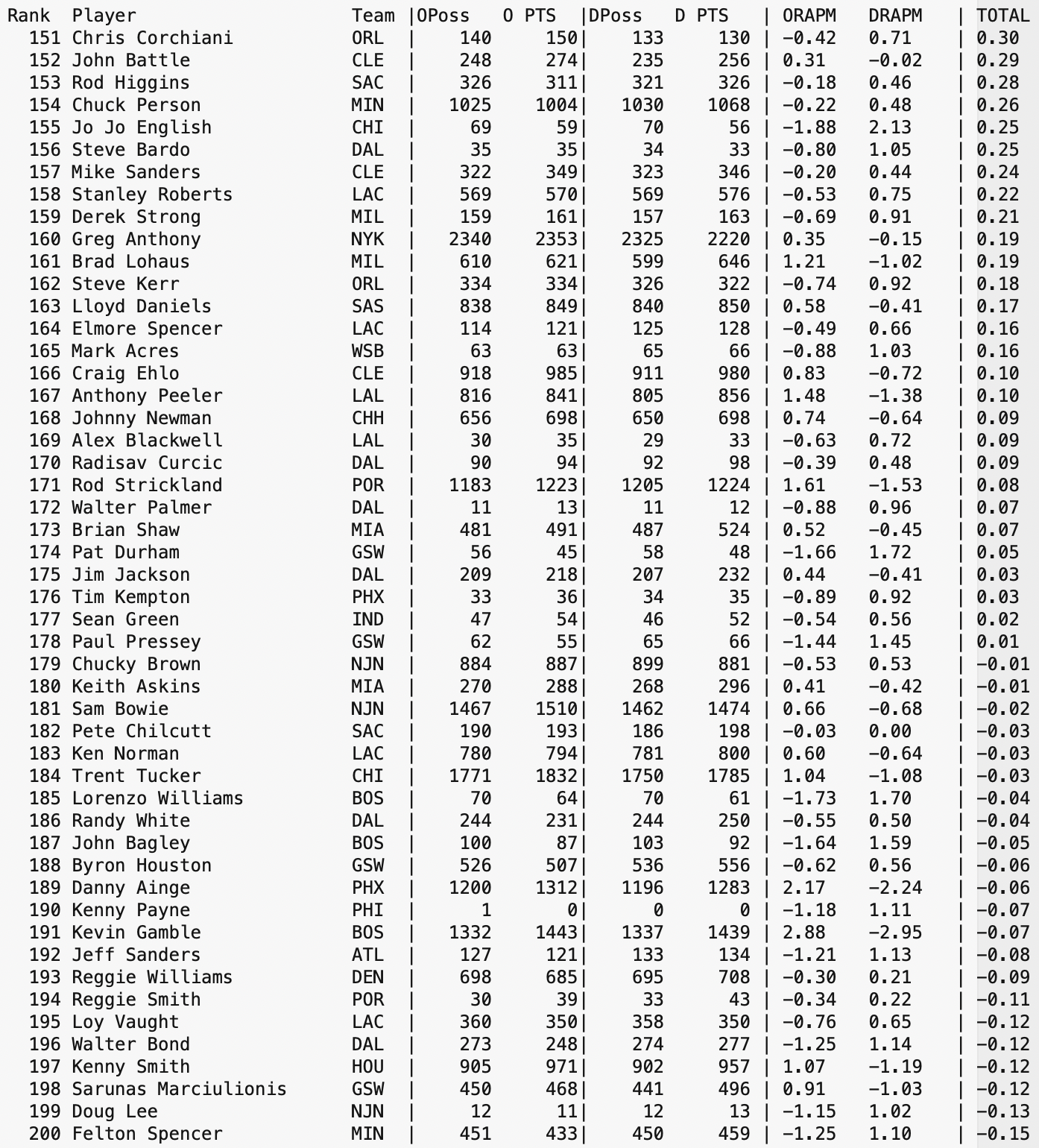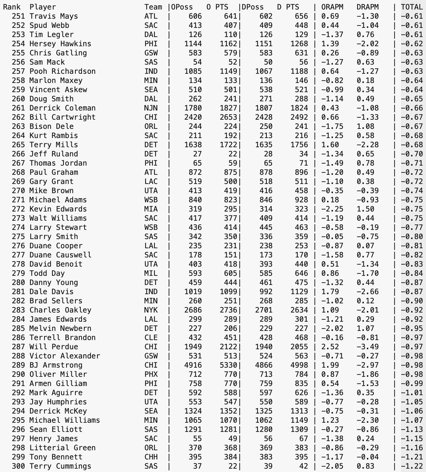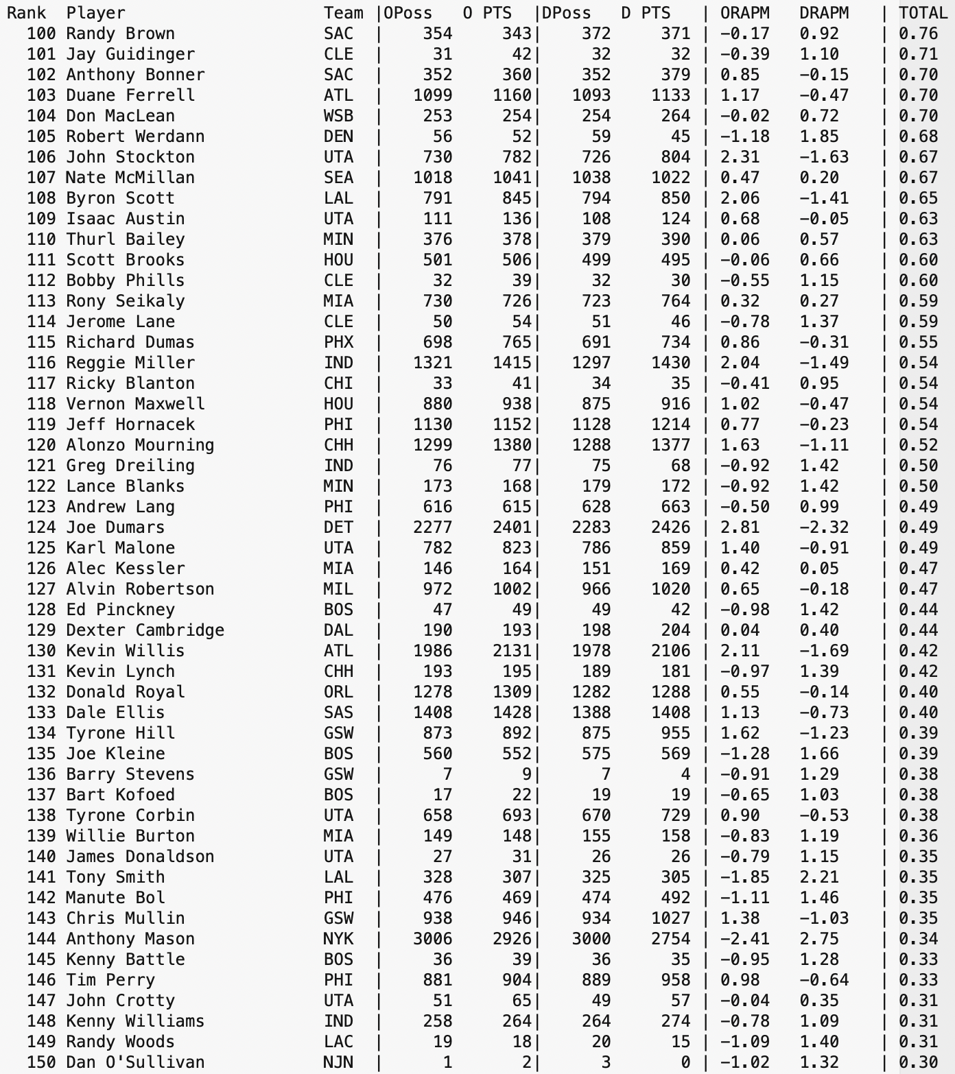 From my video library of past games, I have been slowly reconstructing NBA Stint Data for several seasons prior to the 1993 Season’s start of the Play-By-Play era of statistics tracking of NBA games. This is a lengthy effort in trying to give some insight to interactions between players, at least from a stint level. When the project is more complete, data will become more readily available. Until then, here is a