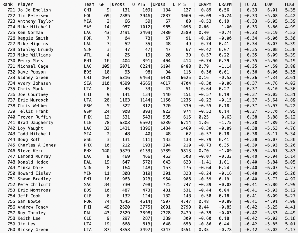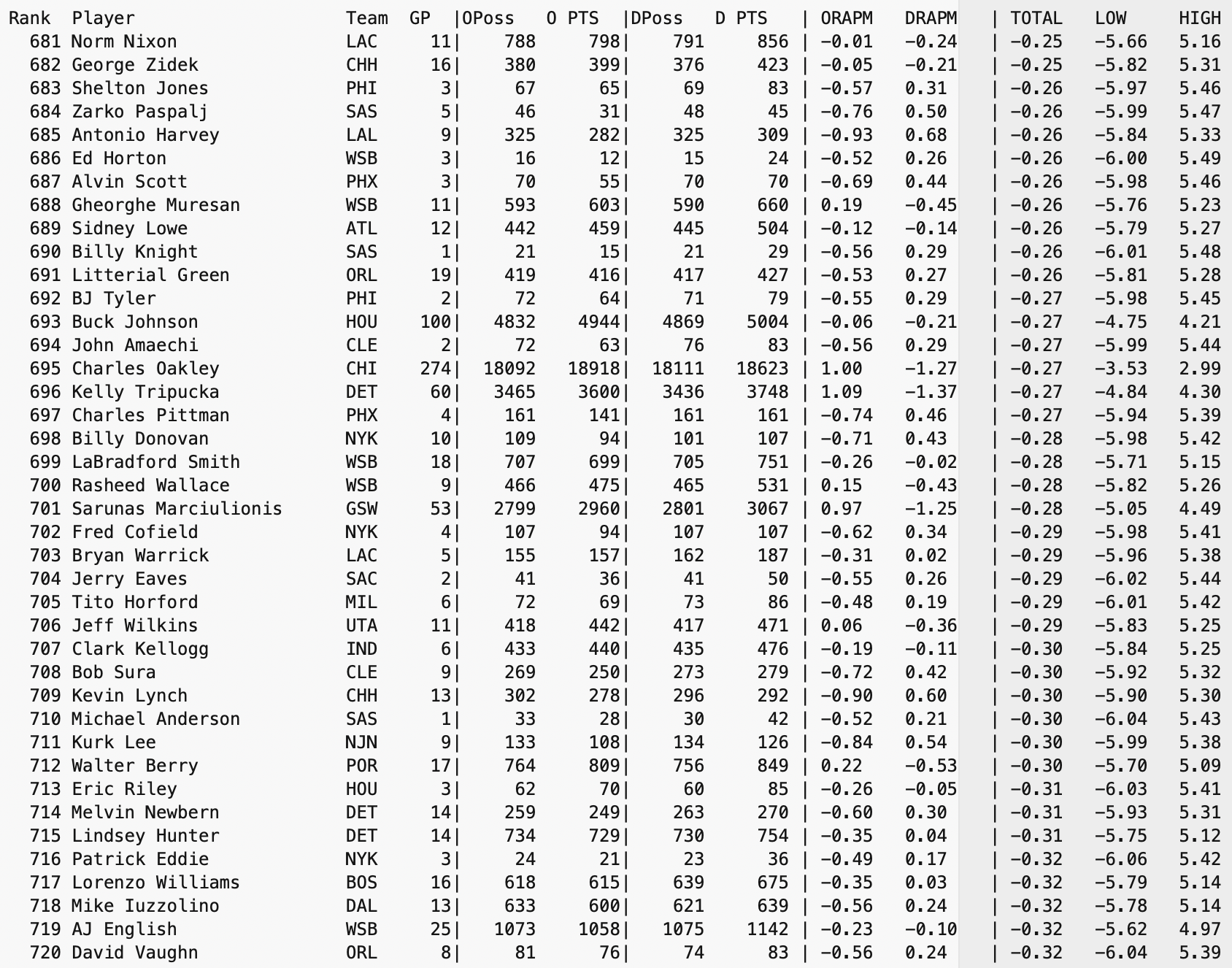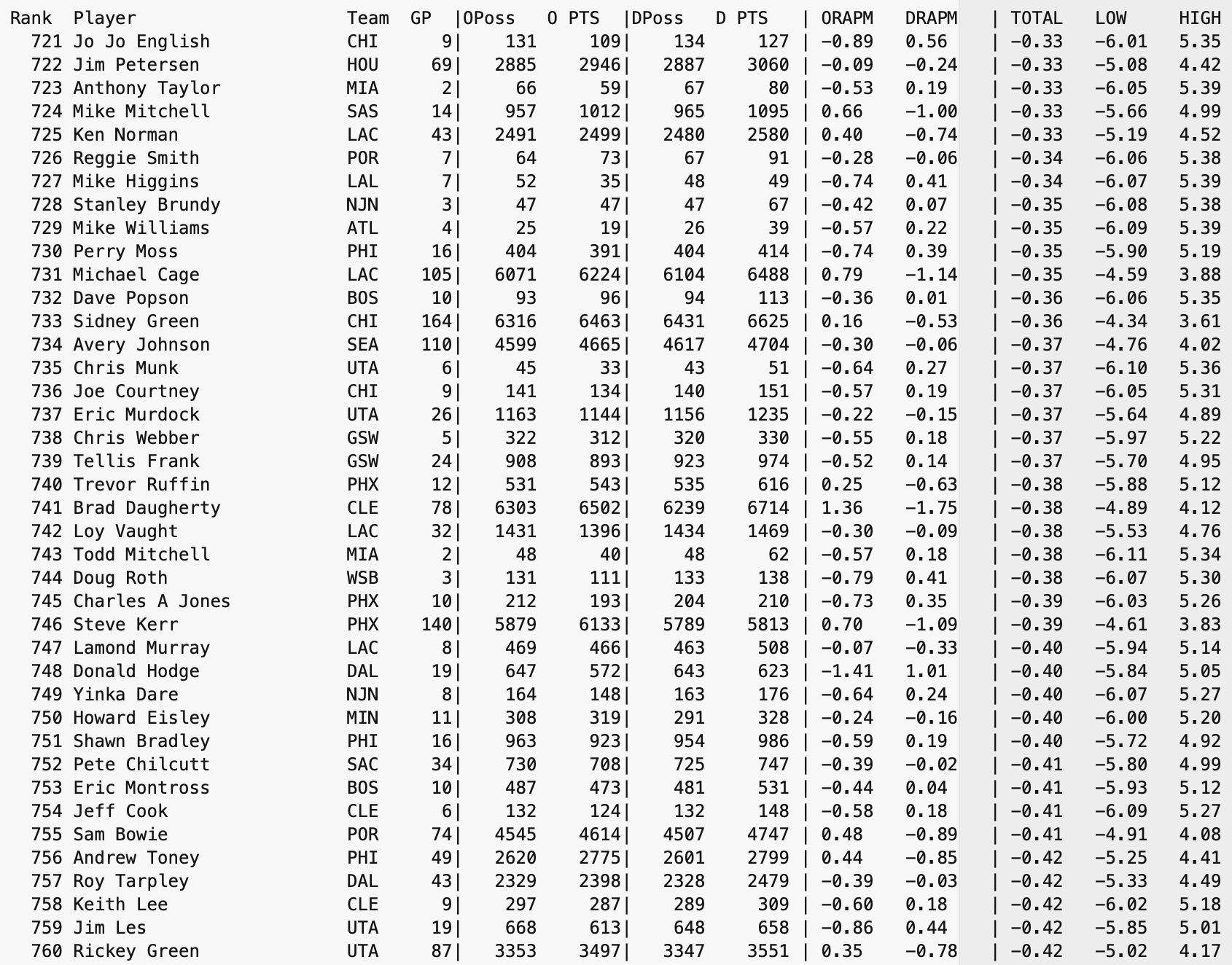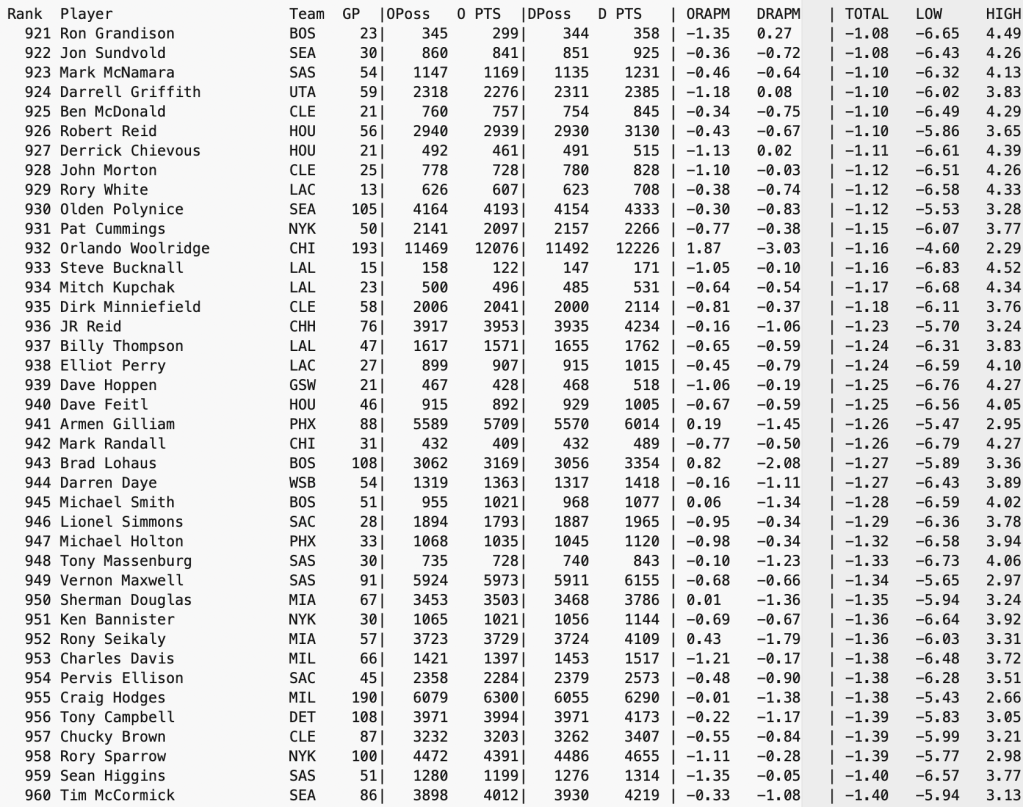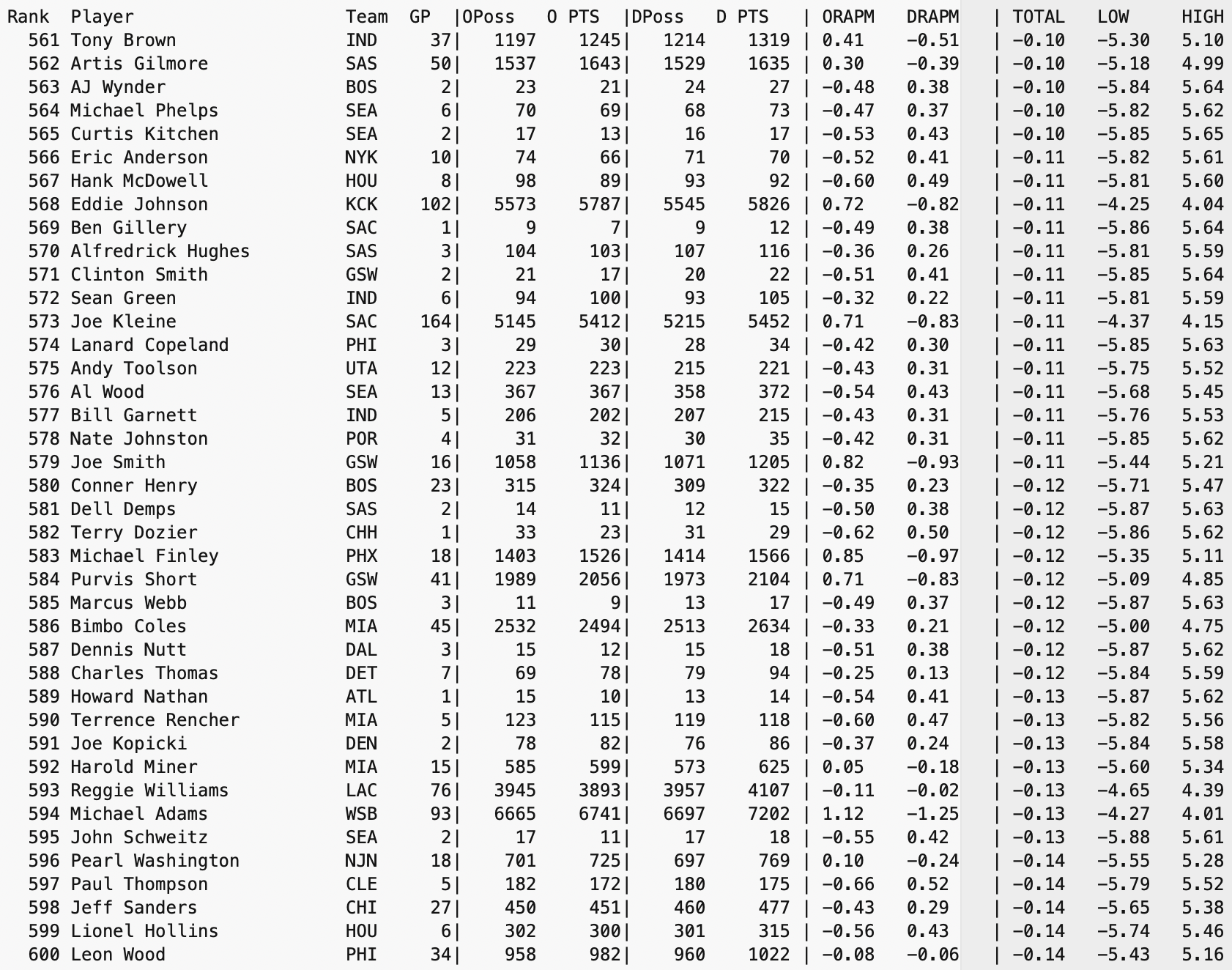 Also included in the table are LOW and HIGH, which are the confidence intervals associated with each RAPM estimate.