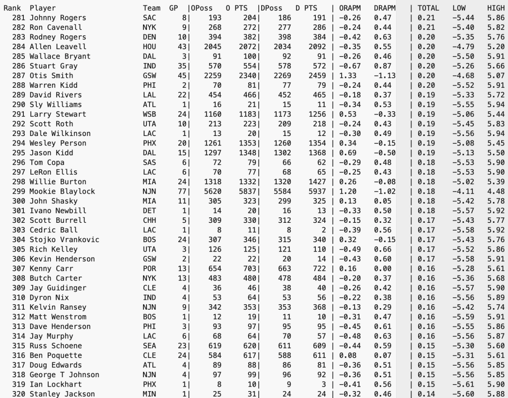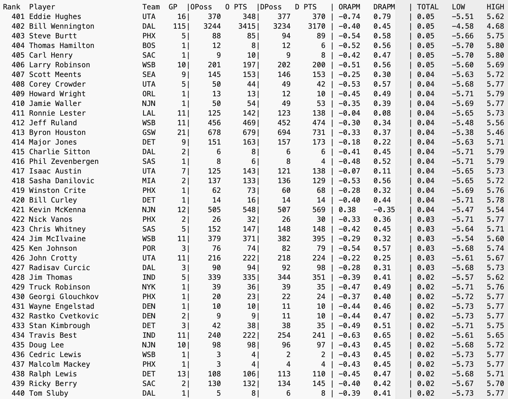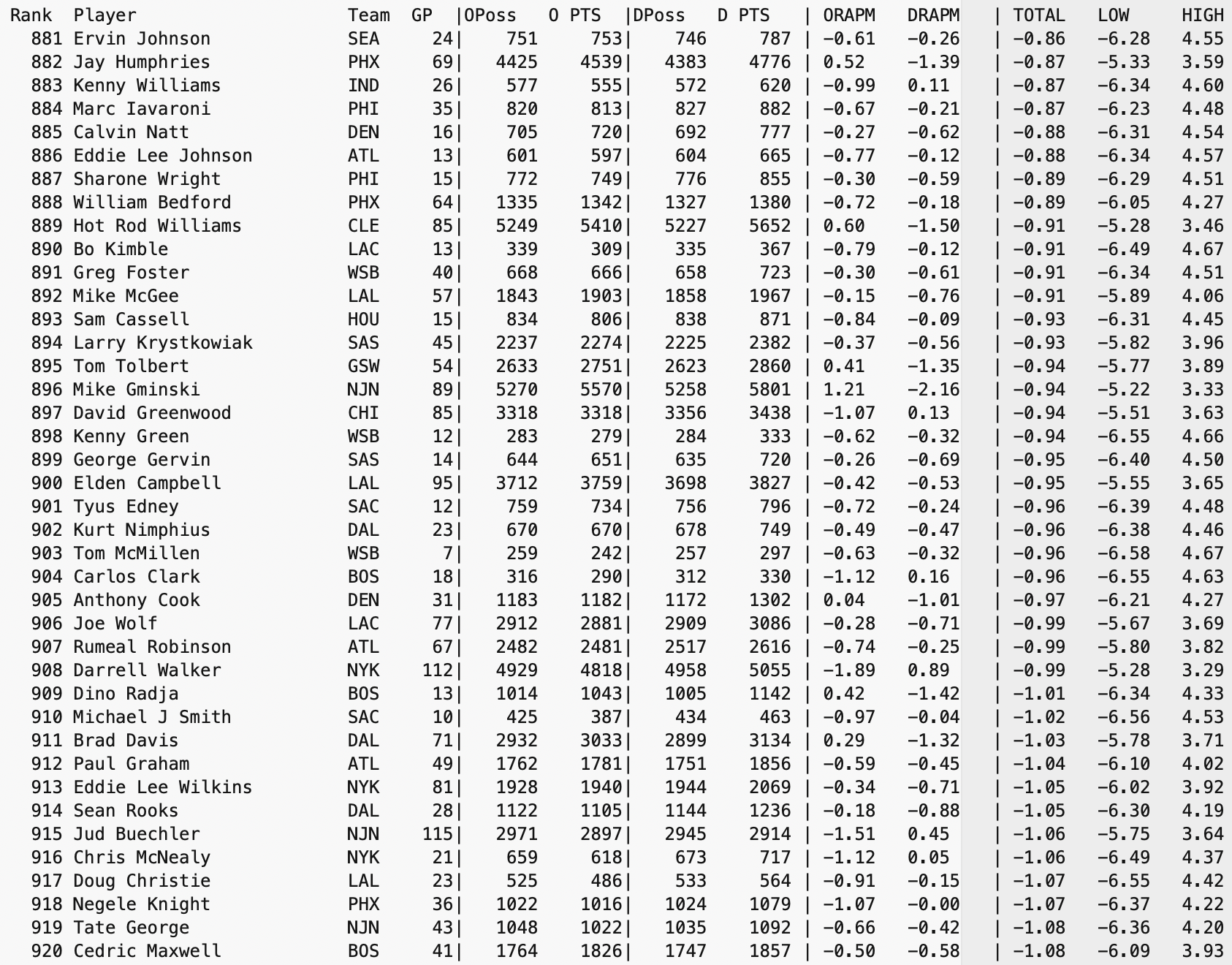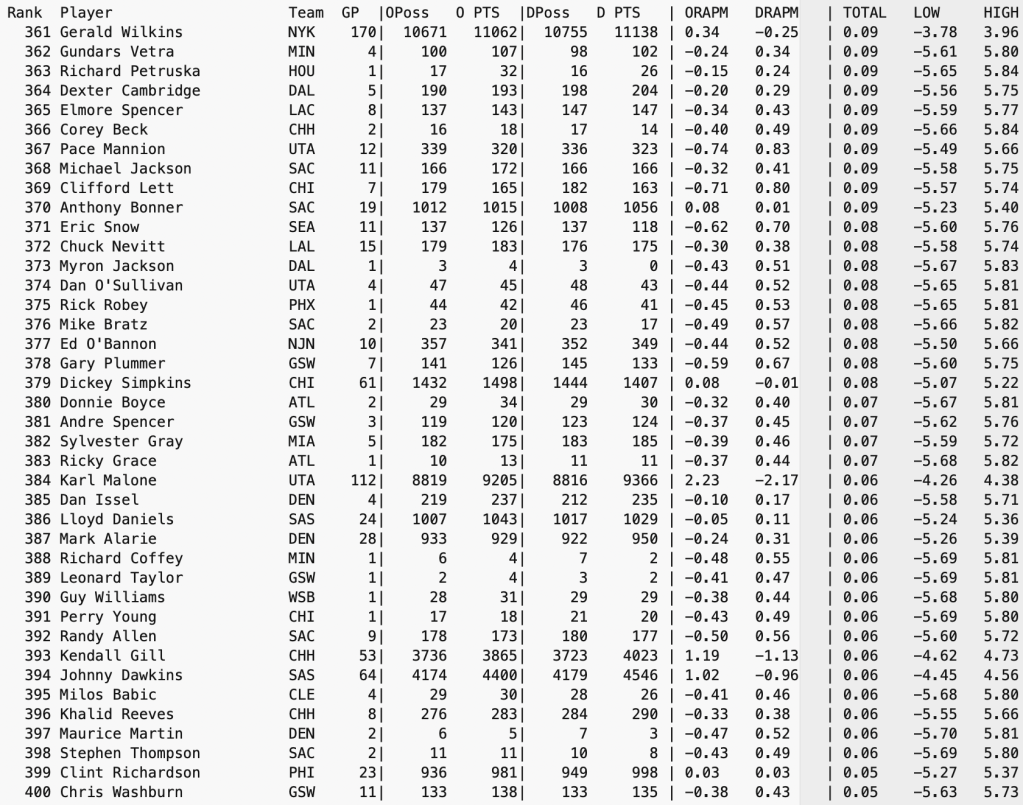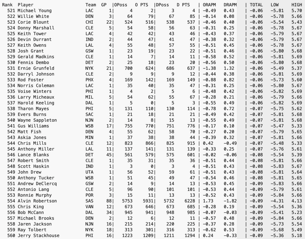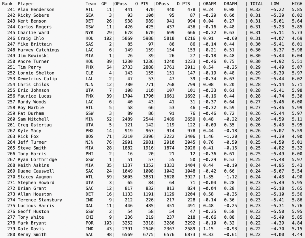 Also included in the table are LOW and HIGH, which are the confidence intervals associated with each RAPM estimate.