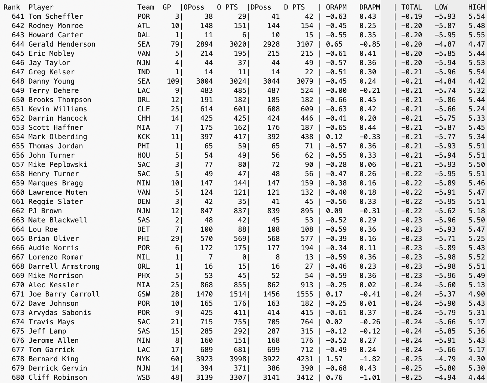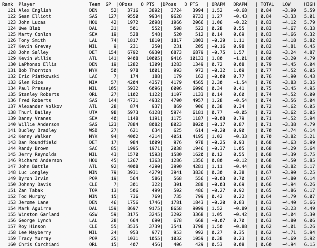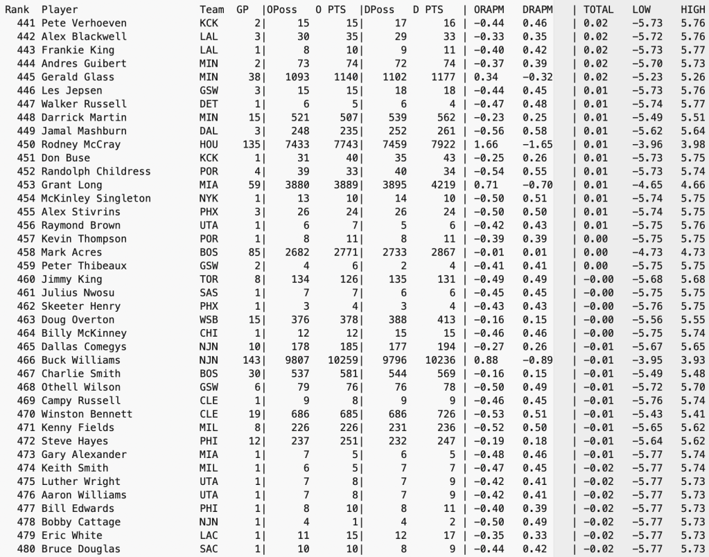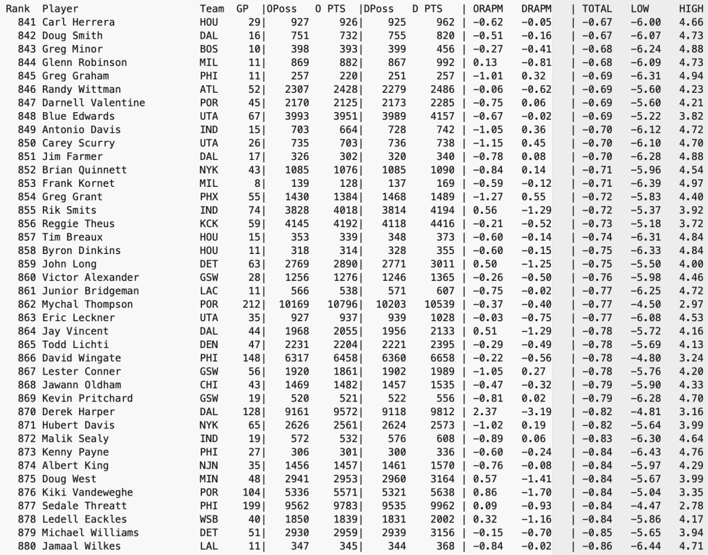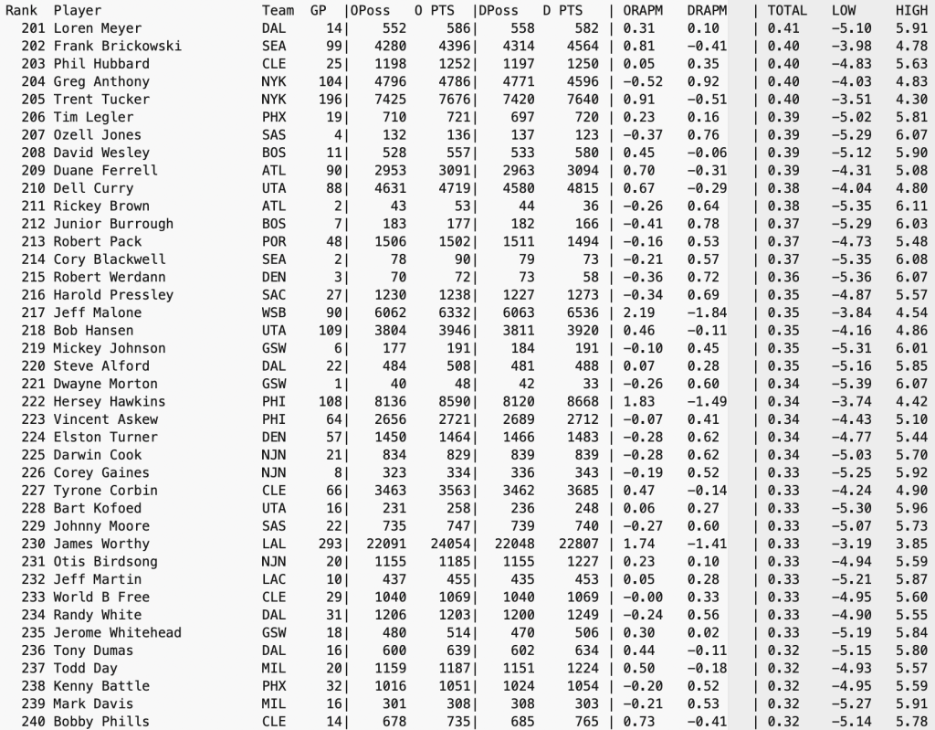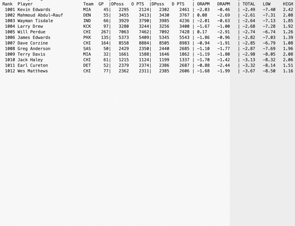 Also included in the table are LOW and HIGH, which are the confidence intervals associated with each RAPM estimate.