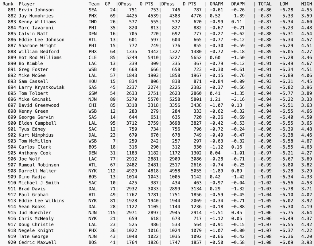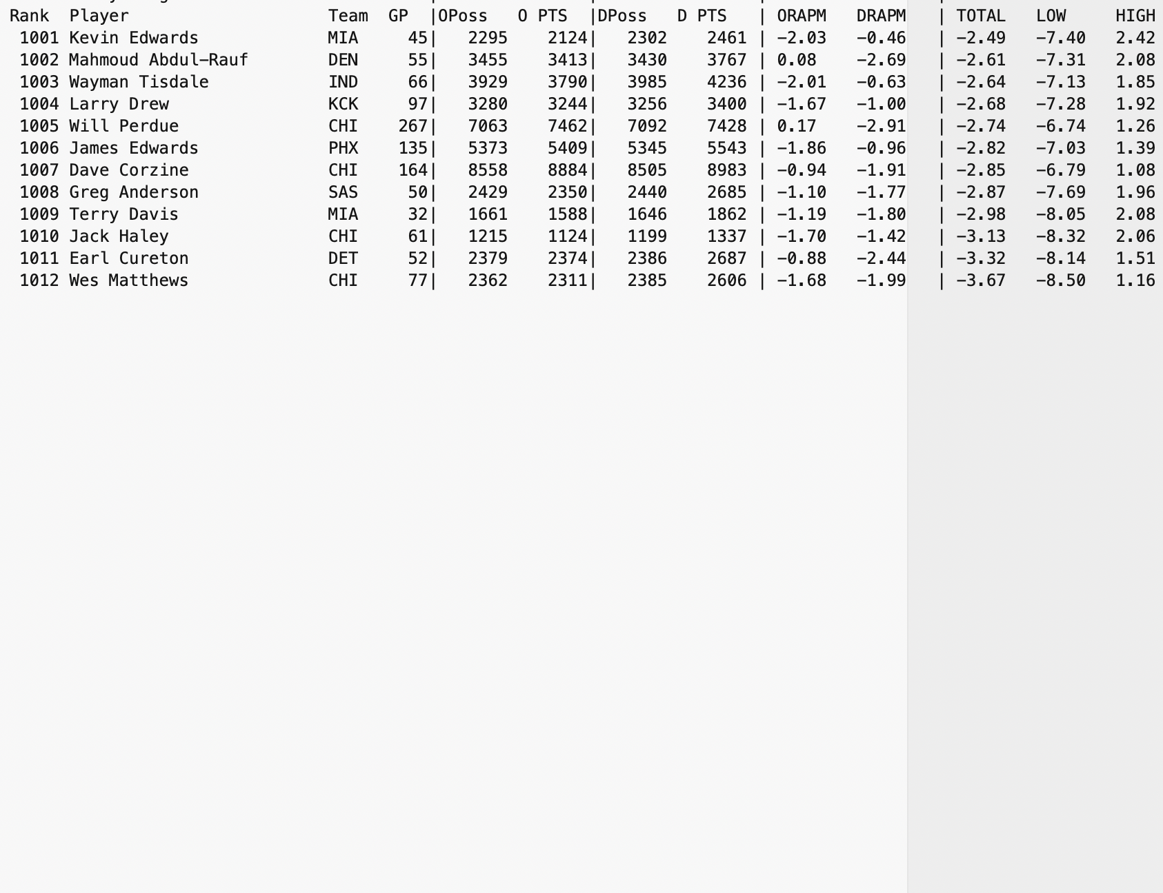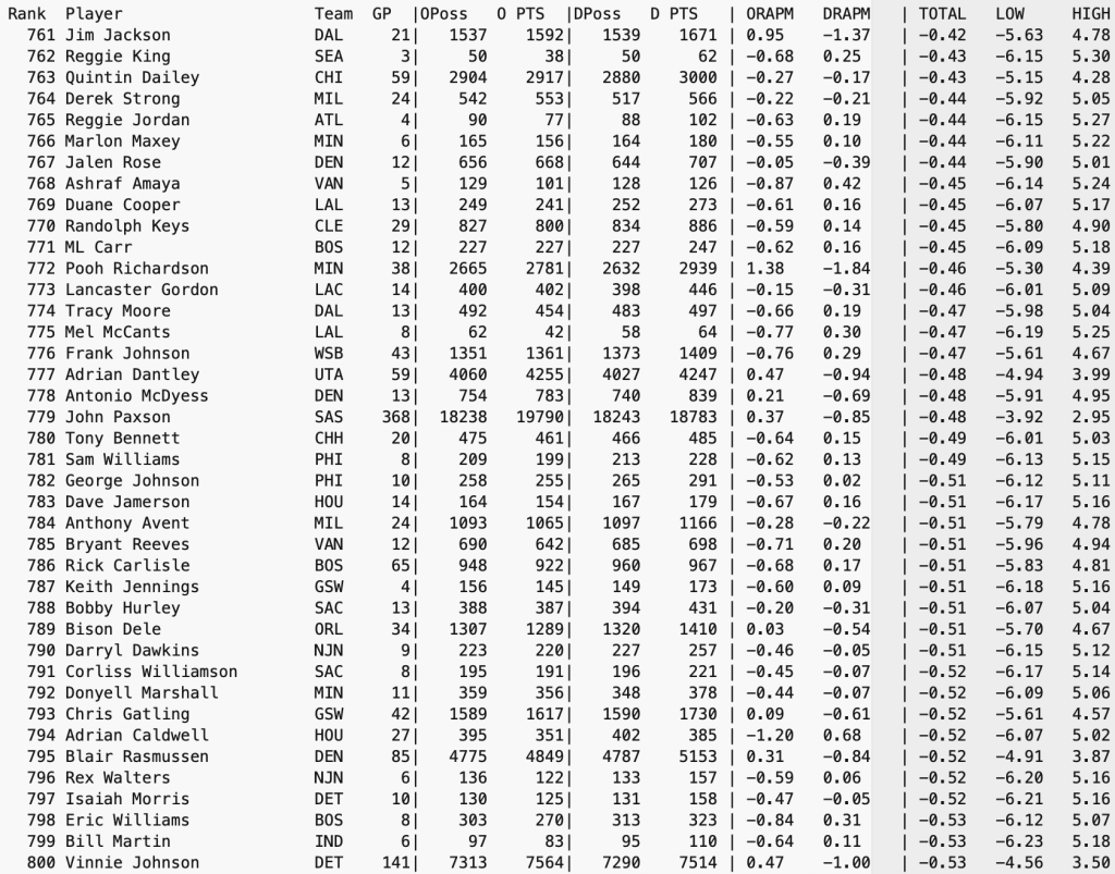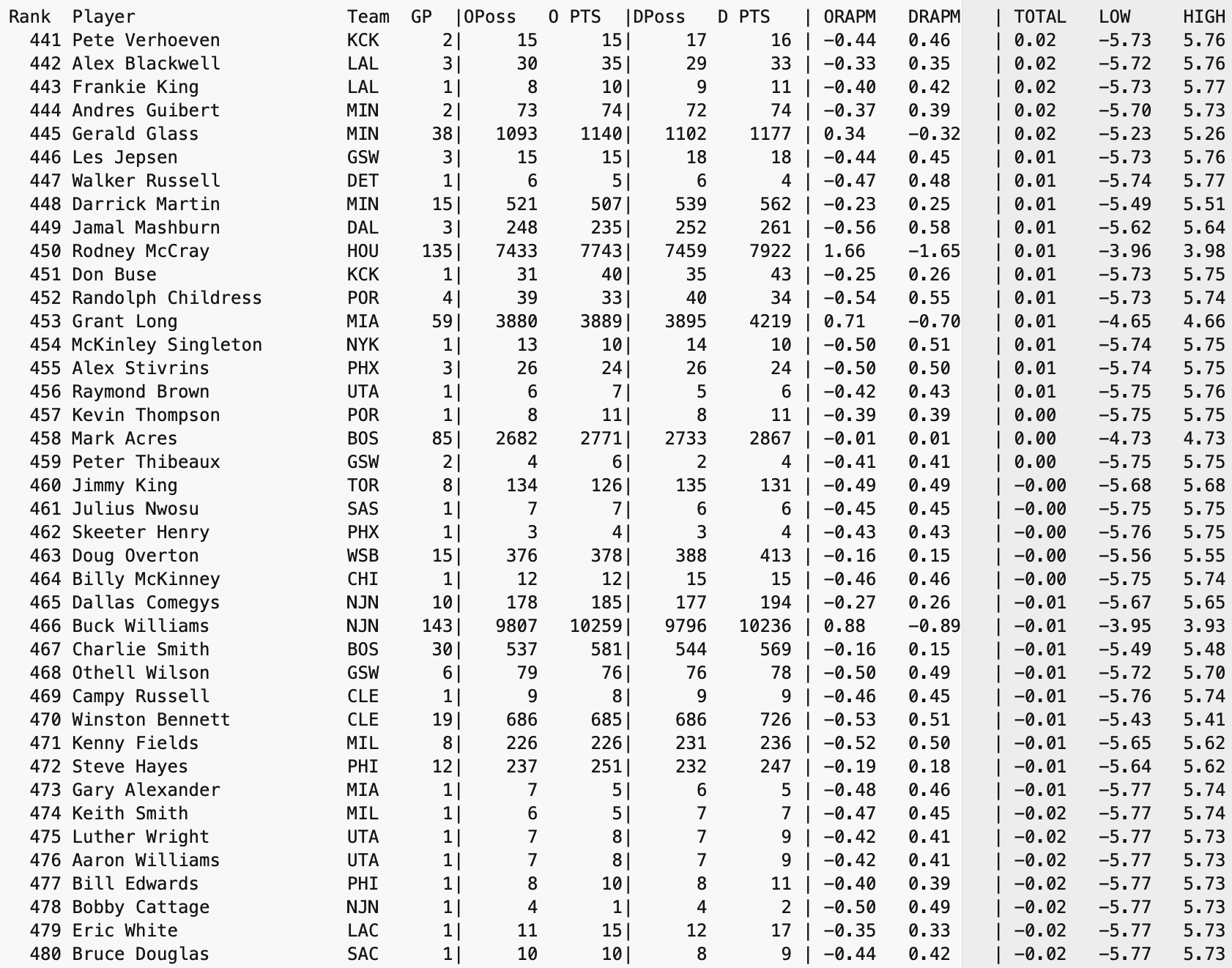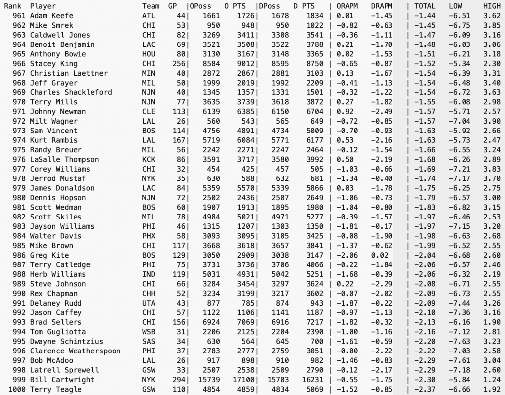 Also included in the table are LOW and HIGH, which are the confidence intervals associated with each RAPM estimate.