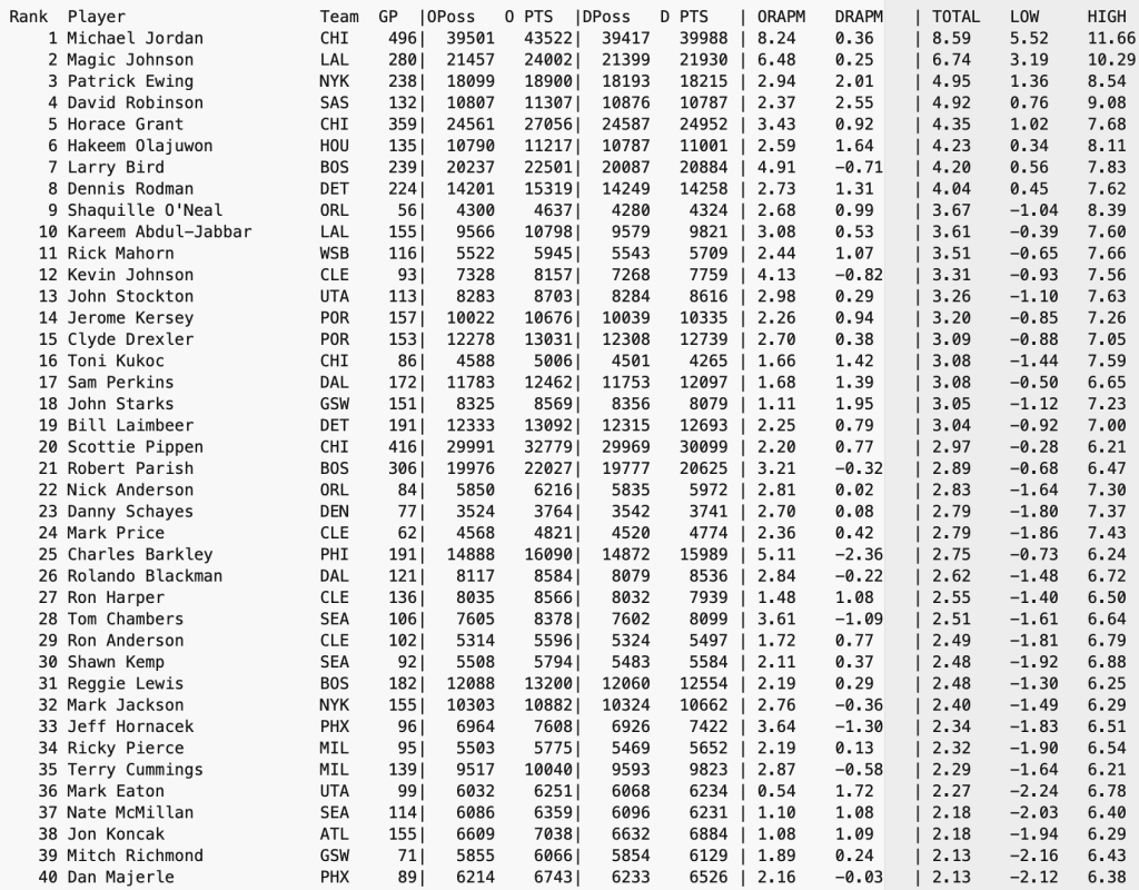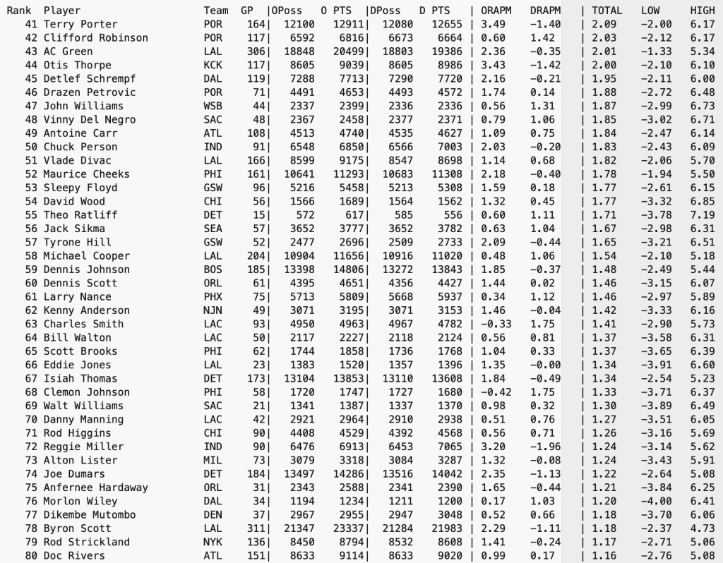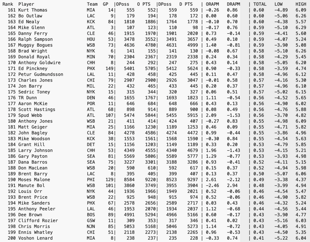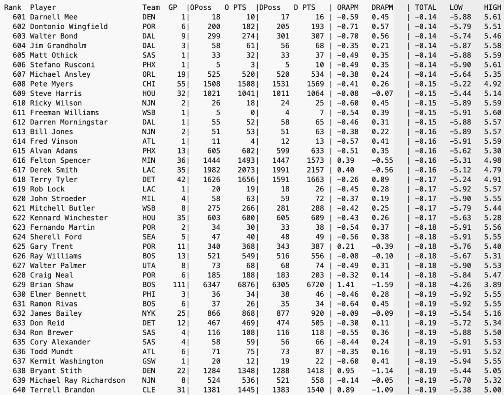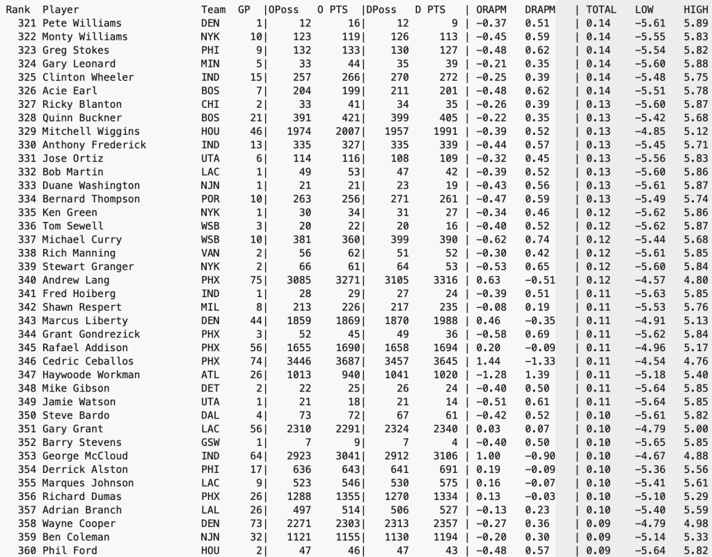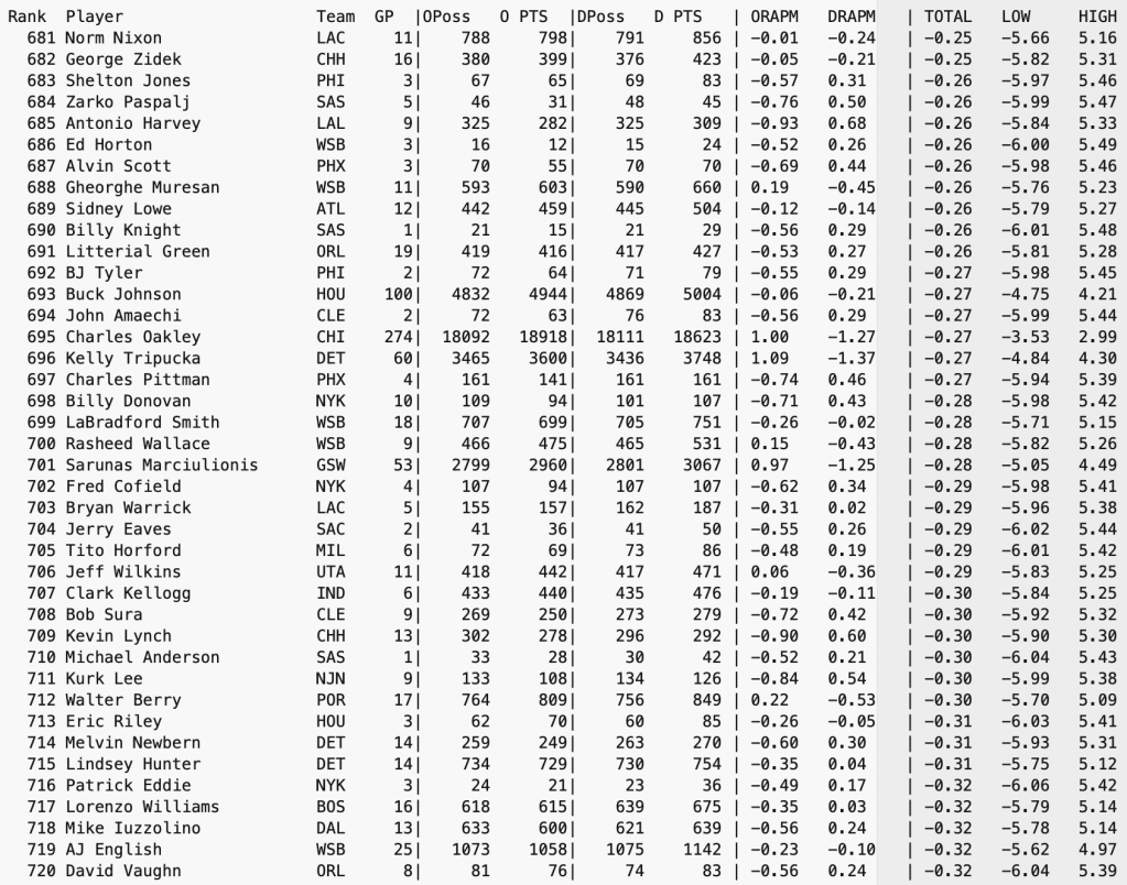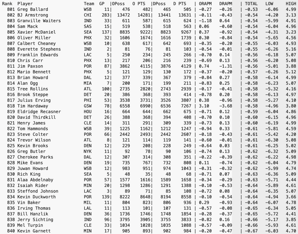 Also included in the table are LOW and HIGH, which are the confidence intervals associated with each RAPM estimate.